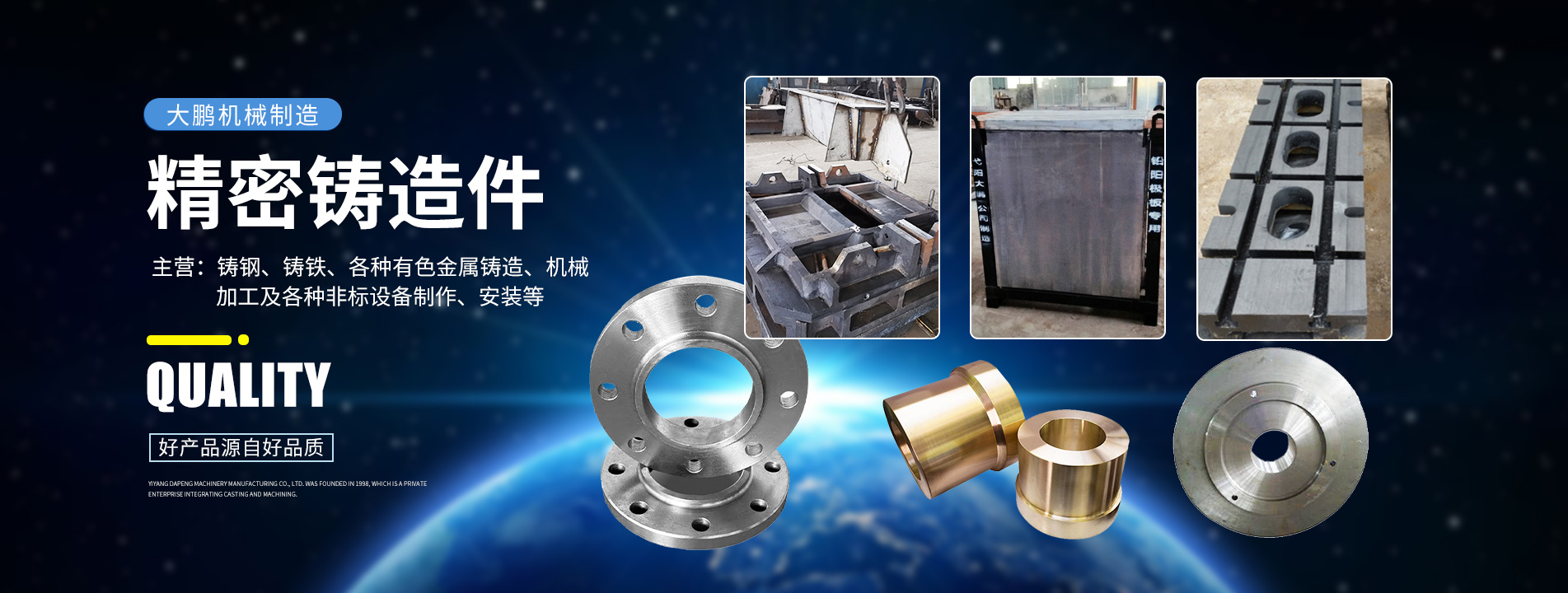 弋陽大鵬機(jī)械制造有限責(zé)任公司創(chuàng)建于1998年,是以專業(yè)鑄造和機(jī)械加工為一體的民營企業(yè)。公司占地面積28000平方米,廠房、辦公等建筑面積8000m2。如今現(xiàn)有員工70余人,專業(yè)技術(shù)人員20余人,公司下設(shè)有材料剪切壓塊車間、鑄造車間、精鑄車間、金加工車間、熱處理車間、理化室等。